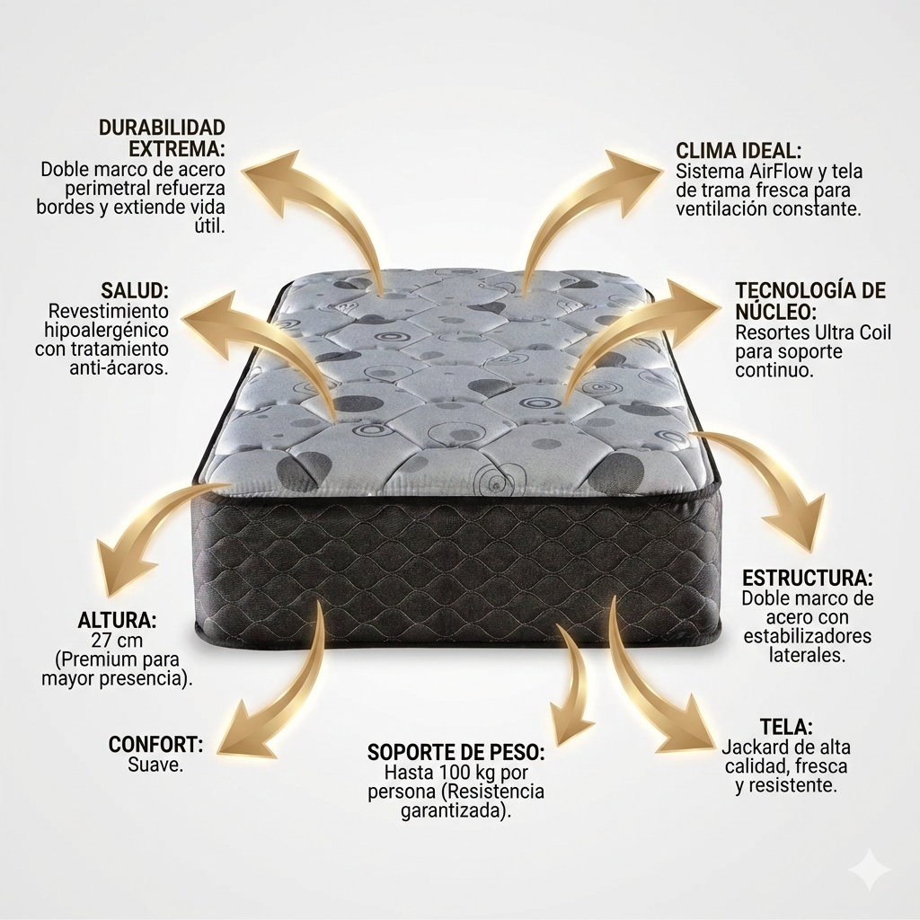 Durabilidad Extrema: Cuenta con un doble marco de acero perimetral. Olvidate de que los bordes se deformen; podés usar el 100% de la superficie del colchón.