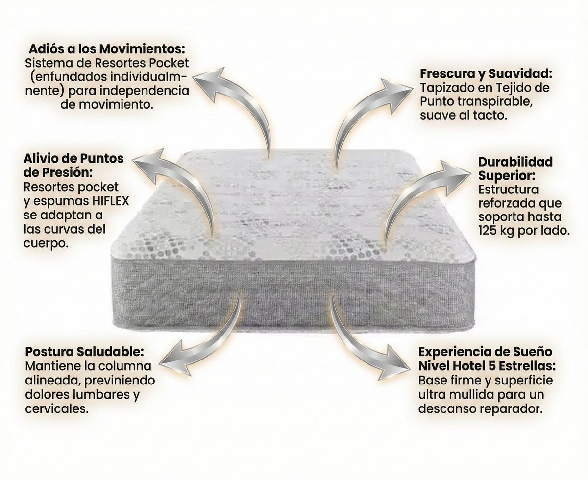 Durabilidad Superior: Estructura súper reforzada que soporta hasta 125 kg reales por lado, garantizando que el colchón mantenga su forma y confort por muchísimos años.