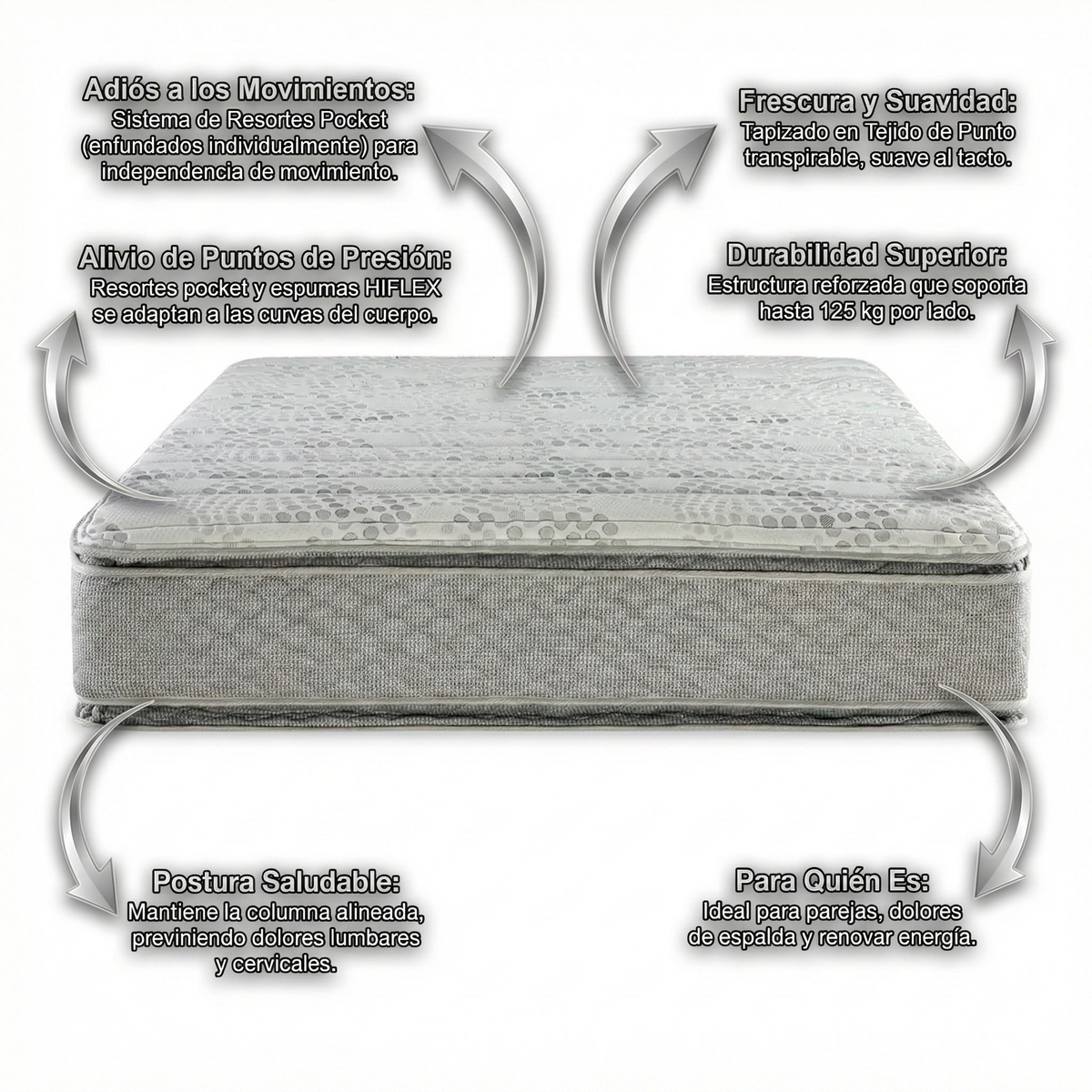 Alivio y Postura Perfecta: Su Doble Pillow Top y la espuma High Flex, lo que hace es que se adapta al cuerpo alineando correctamente la columna adaptándose a la curvatura natural del cuerpo y así brindar un descanso profundo y evitando dolores corporales.