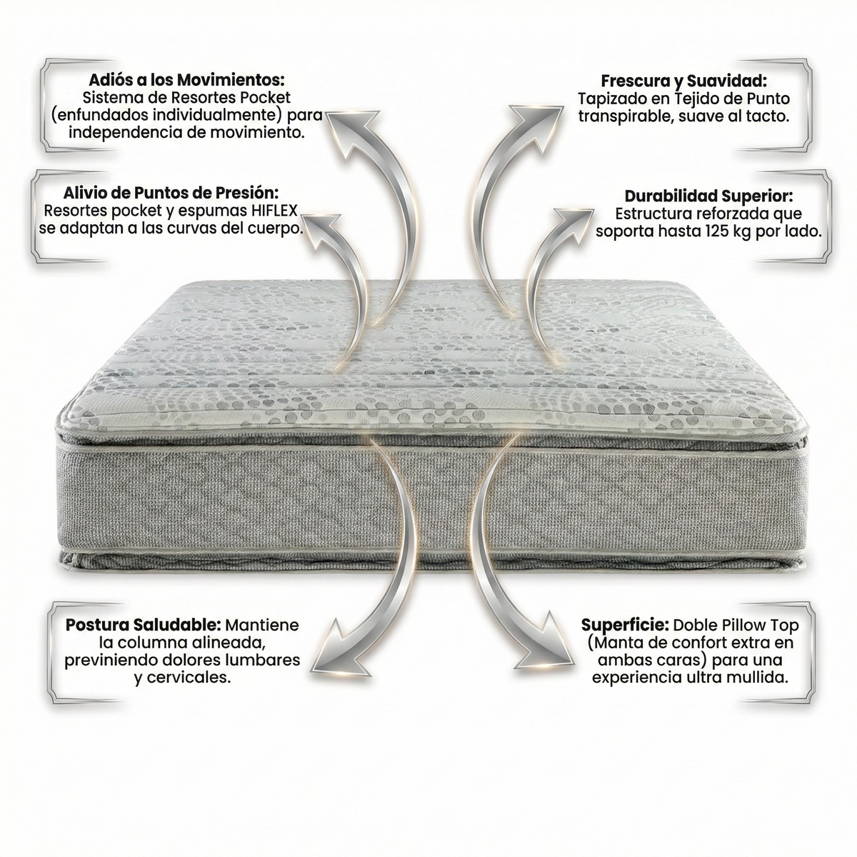 • Alivio y Postura Perfecta: Su Doble Pillow Top y la espuma High Flex, lo que hace es que se adapta al cuerpo alineando correctamente la columna adaptándose a la curvatura natural del cuerpo y así brindar un descanso profundo y evitando dolores corporales.