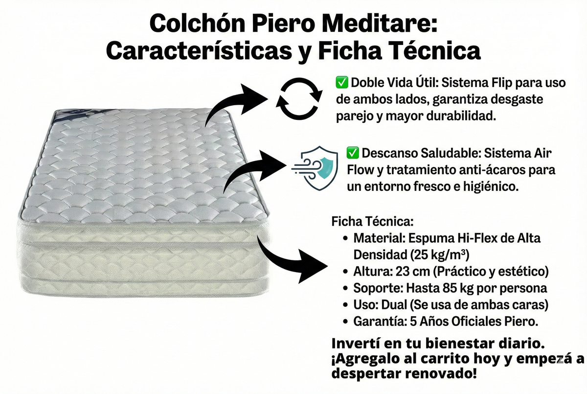 Olvidate de los dolores cervicales y lumbares. El Piero Meditare es un colchón terapéutico diseñado para quienes exigen firmeza, estabilidad y durabilidad. Su exclusiva tecnología de espuma High Flex se adapta a tu cuerpo para alinear la columna al instante, garantizando un descanso profundo y reparador.